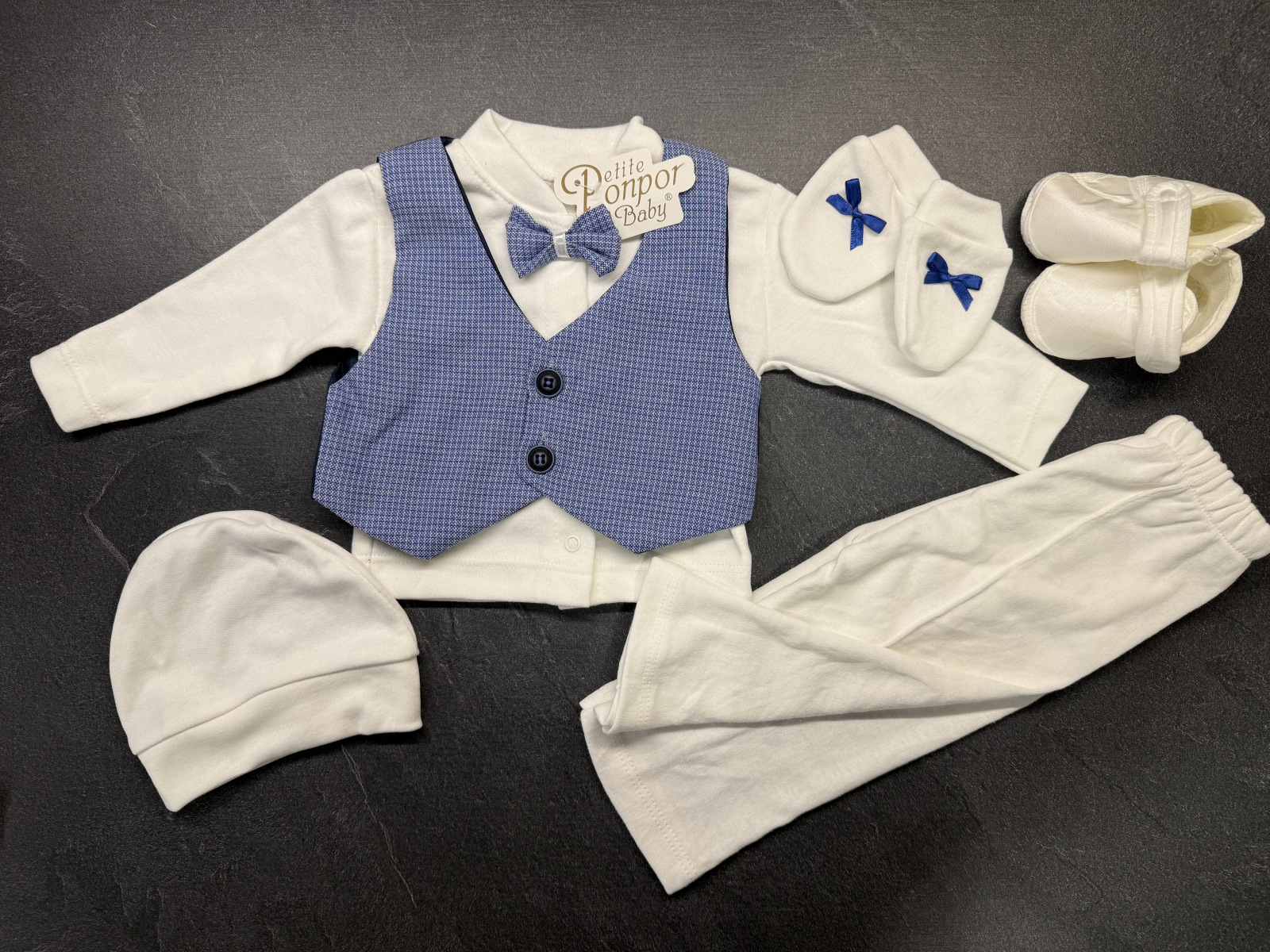Elegantný chlapčenský komplet vhodné na príležitosť, na krst, na svadbu. Veľkosť cca 62 (orientujte sa prosím podľa rozmerov), farba smotanová, modrá. Súprava obsahuje: košieľku s kravatkou, vestičku, nohavice, čiapočku, saténové papučky a rukavičky. Rozmery: košieľka: dĺžka 26 cm, dĺžka rukáva od ramena 20 cm, nohavice: vonkajšia dĺžka 37cm, vnútorná dĺžka 17 cm.