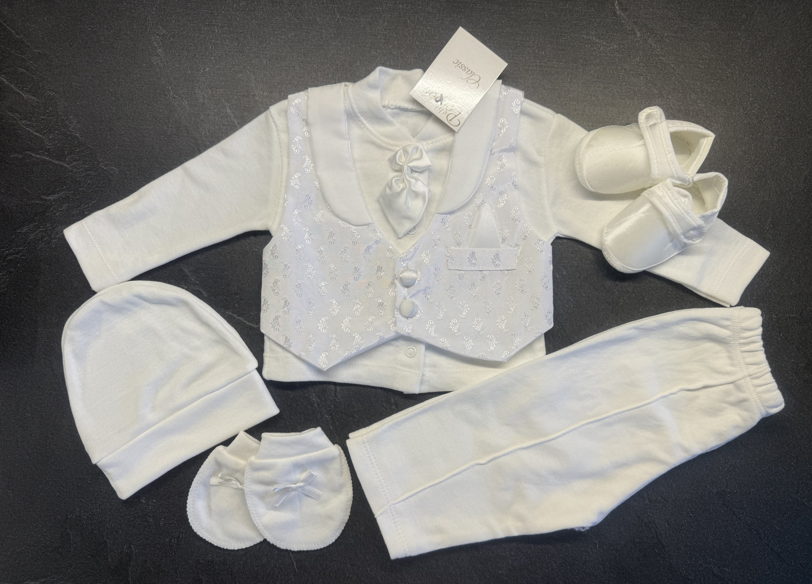 Súprava obsahuje košieľku s motýlikom, vestičku, nohavice, rukavičky, čiapočku a saténové papučky.