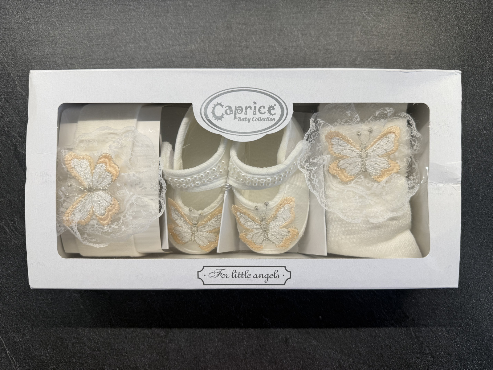 Darčekový set, značka CAPRICE BABY. Súprava obsahuje saténové papučky, čiapočku a motýlik. Papučky majú dĺžku chodidla 10 cm.