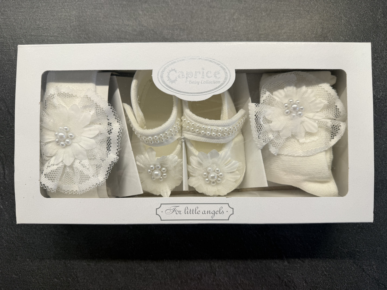 Darčekový set, značka CAPRICE. Súprava obsahuje saténové papučky, pančušky a čelenku. Pančušky veľkosť cca 56/62. Papučky majú dĺžku chodidla 10 cm.