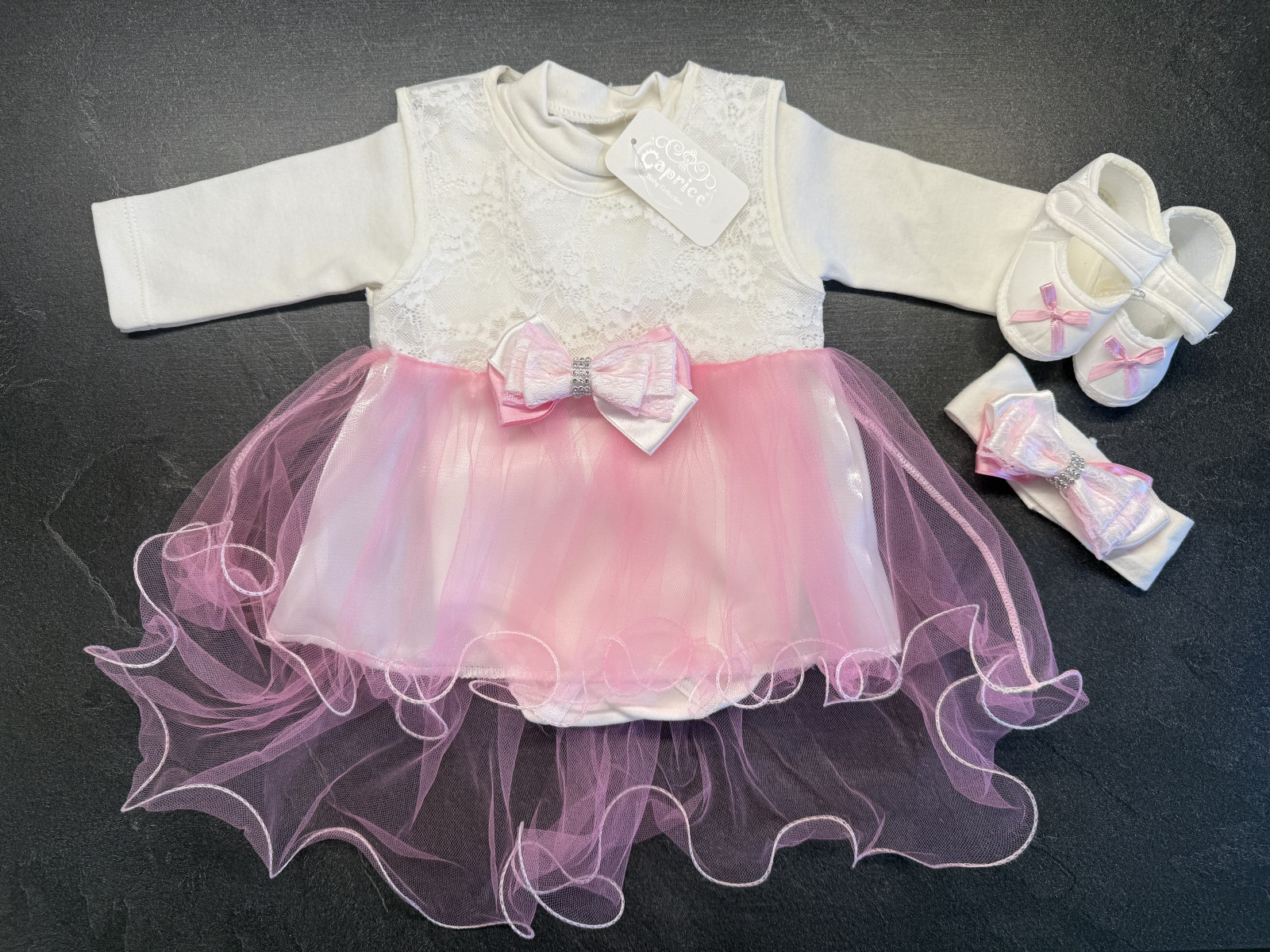 Súprava obsahuje: šatočky, detské body, saténové papučky a čelenku.