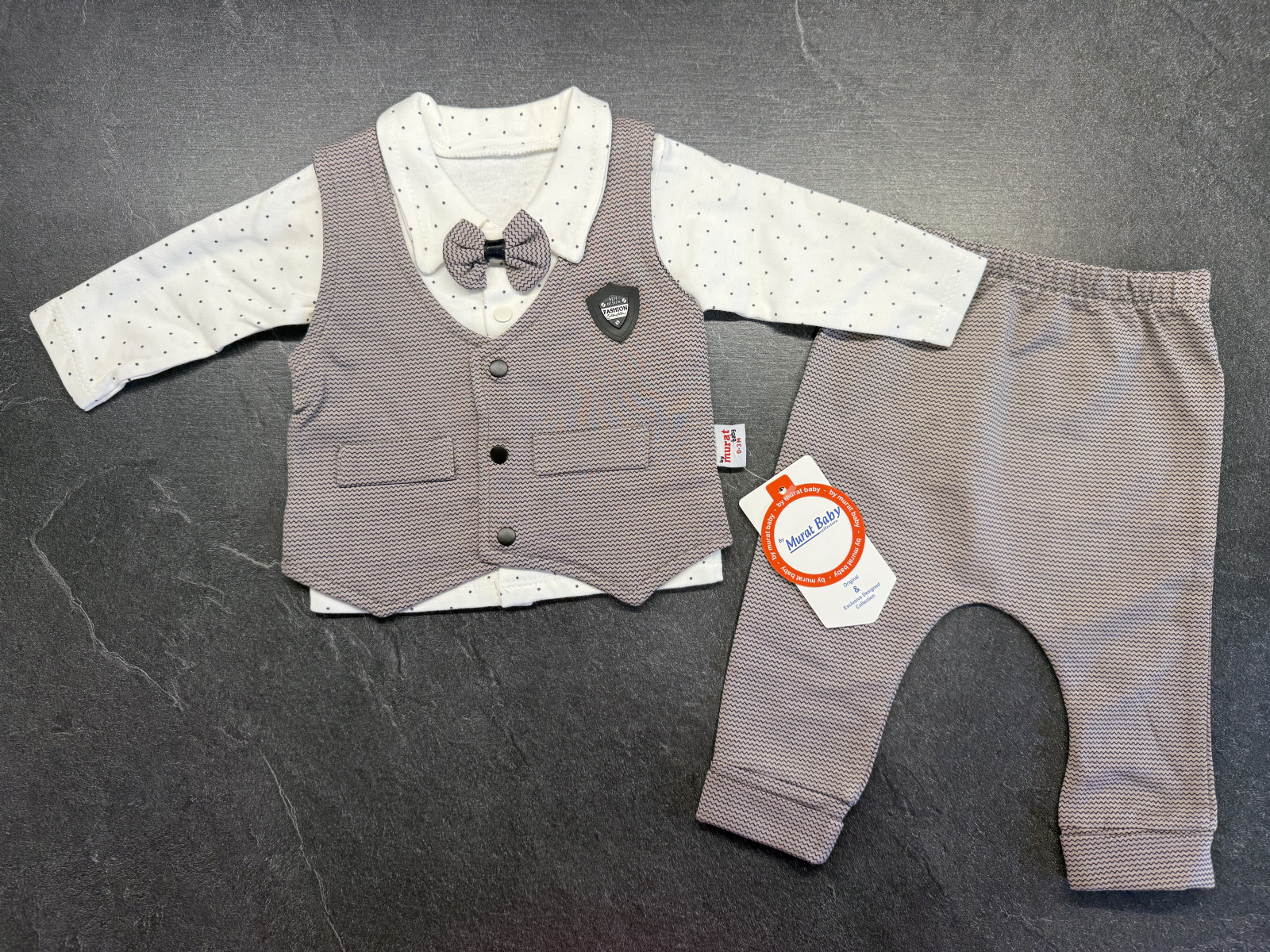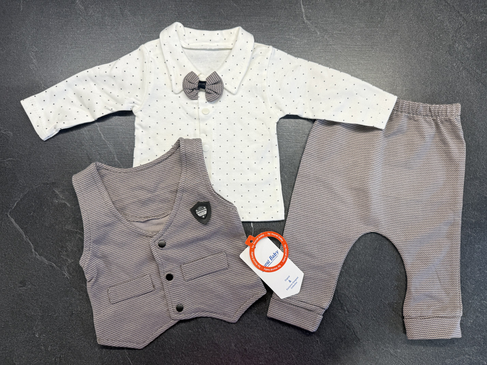 3 dielna elegantná kojenecká súprava, veľkosť na visačke 0-3 mesiace - cca 56. Súprava obsahuje vestu, košieľku s motýlikom a nohavice. Zloženie 100 % bavlna