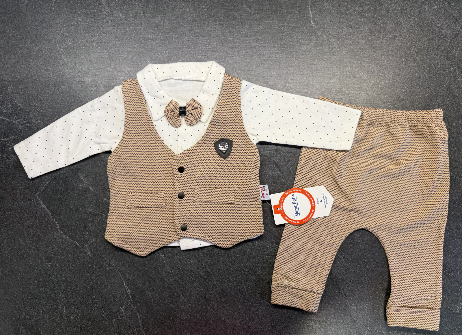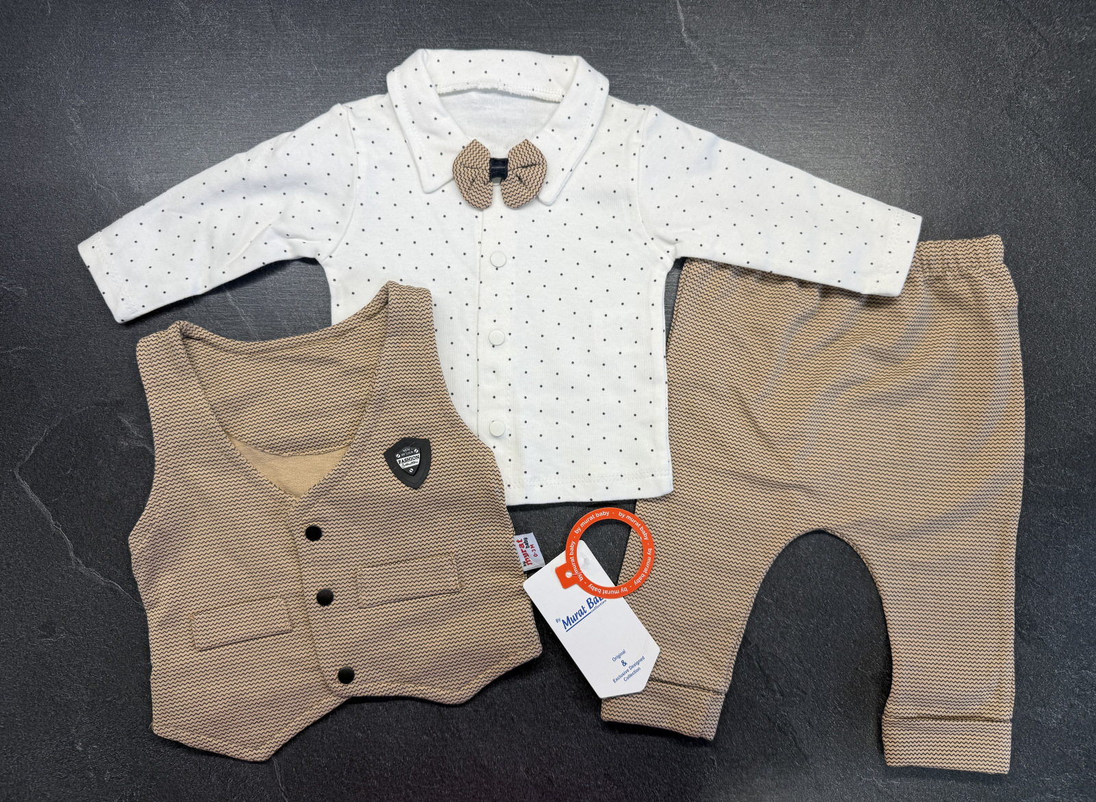 3 dielna elegantná kojenecká súprava, veľkosť na visačke 6-9 mesiacov - cca 68. Súprava obsahuje vestu, košieľku s motýlikom a nohavice. Zloženie 100 % bavlna.