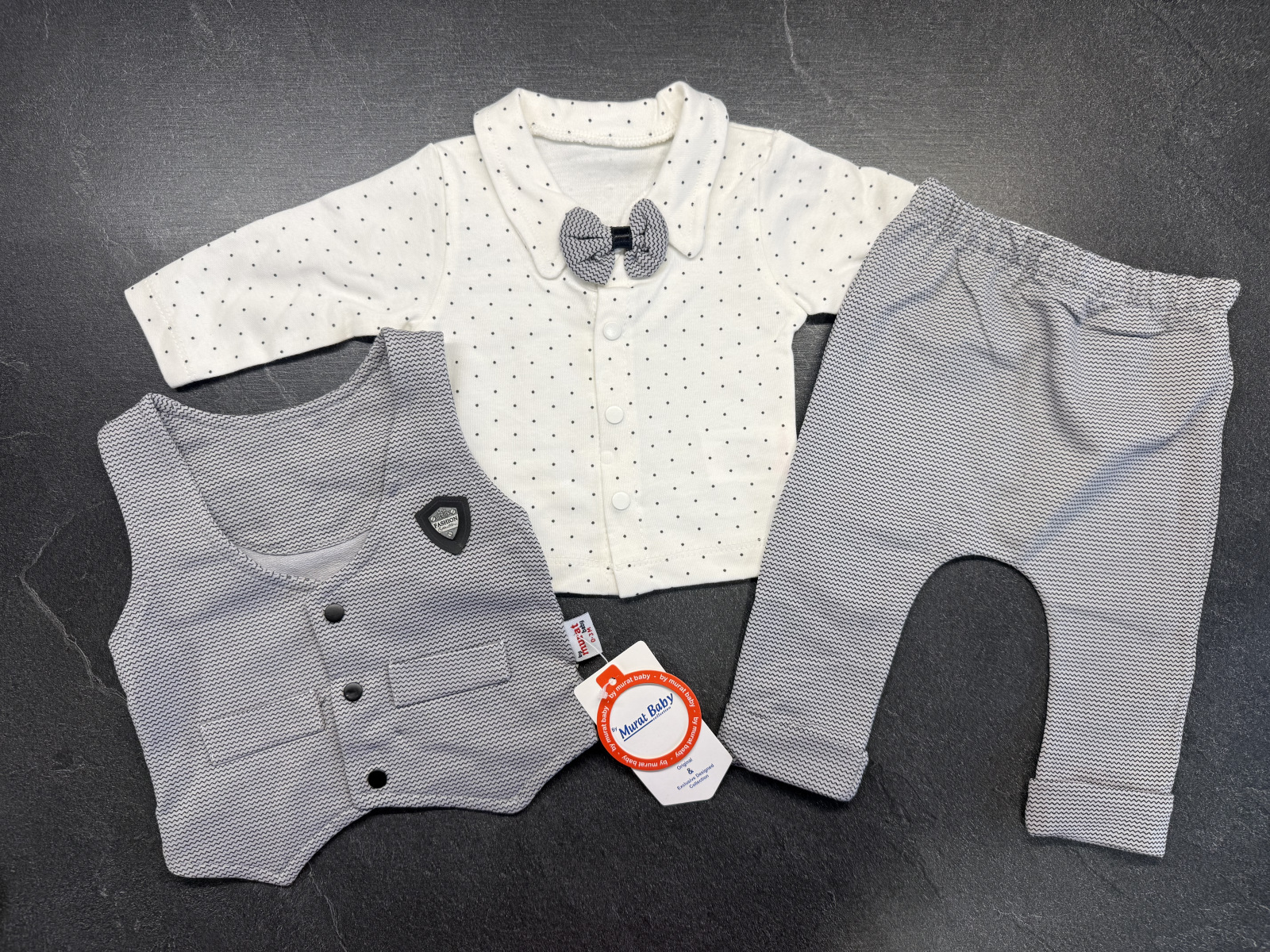 3 dielna elegantná kojenecká súprava, veľkosť na visačke 3-6 mesiacov - cca 62. Súprava obsahuje vestu, košieľku s motýlikom a nohavice. Zloženie 100 % bavlna.