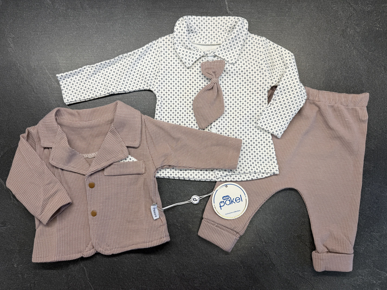 3 dielna elegantná kojenecká súprava, veľkosť na visačke 0-3 mesiace - cca 56, značka minipakel. Súprava obsahuje sako, košieľku s kravatou a nohavice. Zloženie 100 % bavlna