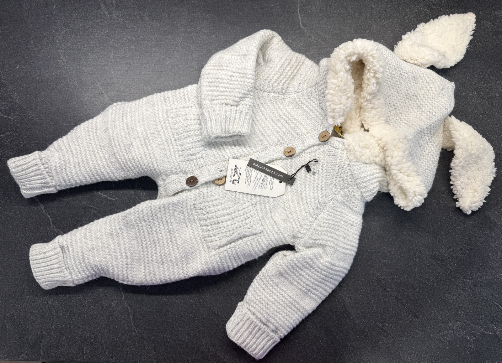 Zimná pletená kombinéza s uškami, značka BERNA BABY. Zapínanie na gombíky. Farba : sivá. Materiál je mäkký a hrejivý, zloženie 70% bavlna a 30% acrylic.