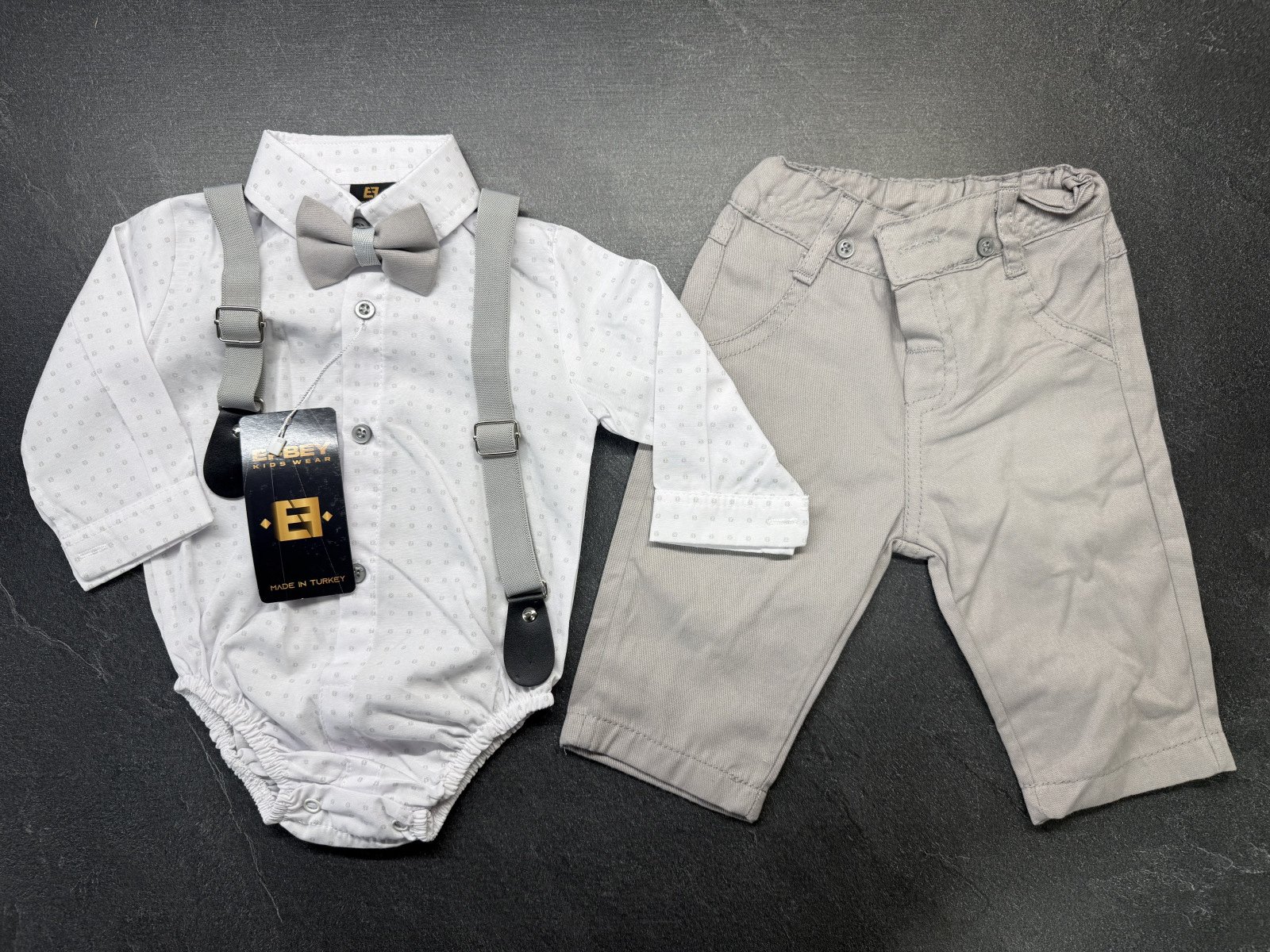 Elegantná súprava, veľkosť na visačke na 3 mesiacov - 62 (orientujte sa prosím podľa rozmerov). Súprava obsahuje vzorované body s dlhým rukávom, sivé nohavice, motýlik na gumičku a traky. Rozmery: body: dĺžka 38 cm, dĺžka rukáva od ramena 22 cm, nohavice: vonkajšia dĺžka 32 cm, vnútorná dĺžka 16 cm, pás vzadu na gumičku.