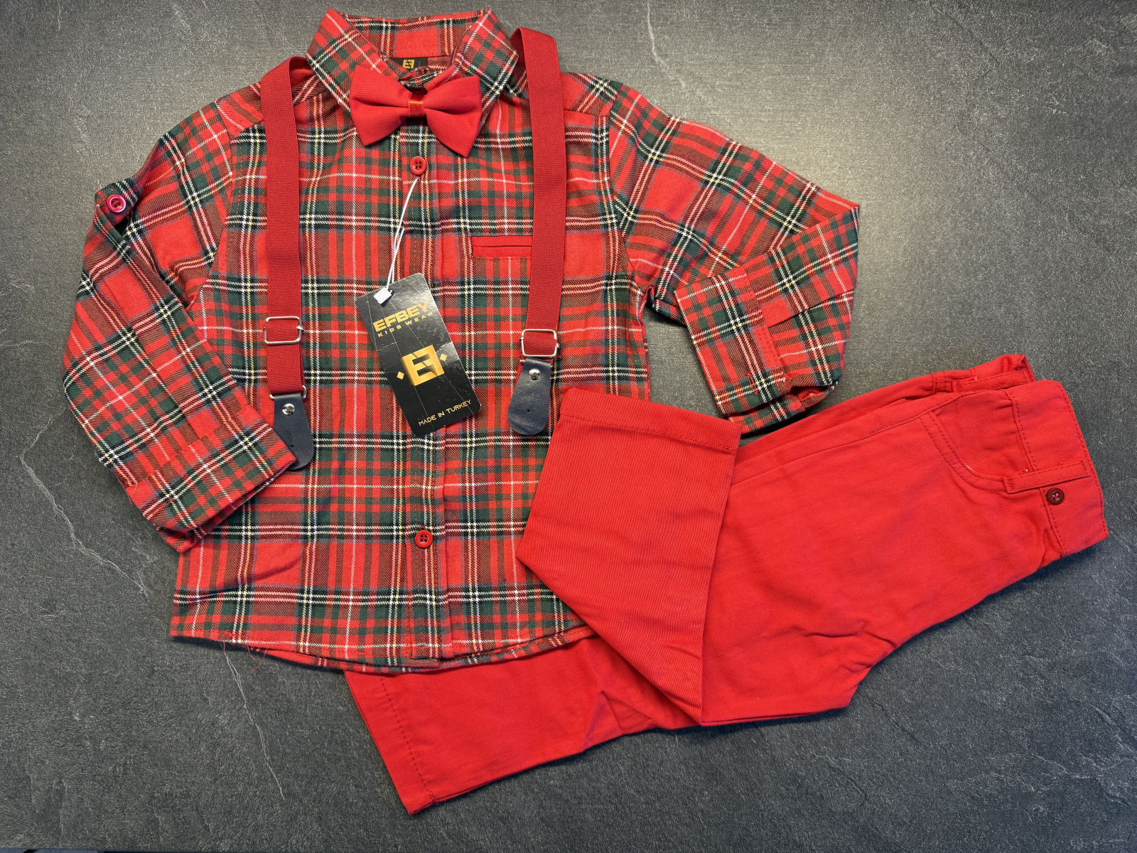 Elegantná detská súprava, veľkosť na visačke na 3 rokov - 98 (orientujte sa prosím podľa rozmerov). Materiál: 80% bavlna, 20% polyester. Súprava obsahuje kockovanú košeľu, červené nohavice, motýlik na nastaviteľnú gumičku a traky. Rozmery: košeľa dĺžka 43 cm, šírka 32 cm x 2, dĺžka rukáva od ramena 34 cm ( dá sa vyhrnúť na krátky rukáv ), nohavice vonkajšia dĺžka 54 cm, vnútorná dĺžka 32 cm, pás vzadu s gumičkou.