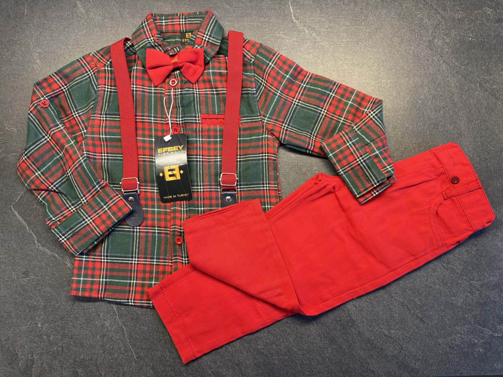 Elegantná detská súprava, veľkosť na visačke na 4 rokov - 104 (orientujte sa prosím podľa rozmerov). Materiál: 80% bavlna, 20% polyester. Súprava obsahuje kockovanú košeľu, červené nohavice, motýlik na nastaviteľnú gumičku a traky. Rozmery: košeľa dĺžka 44 cm, šírka 32 cm x 2, dĺžka rukáva od ramena 34 cm ( dá sa vyhrnúť na krátky rukáv ), nohavice vonkajšia dĺžka 57 cm, vnútorná dĺžka 36 cm, pás vzadu s gumičkou.