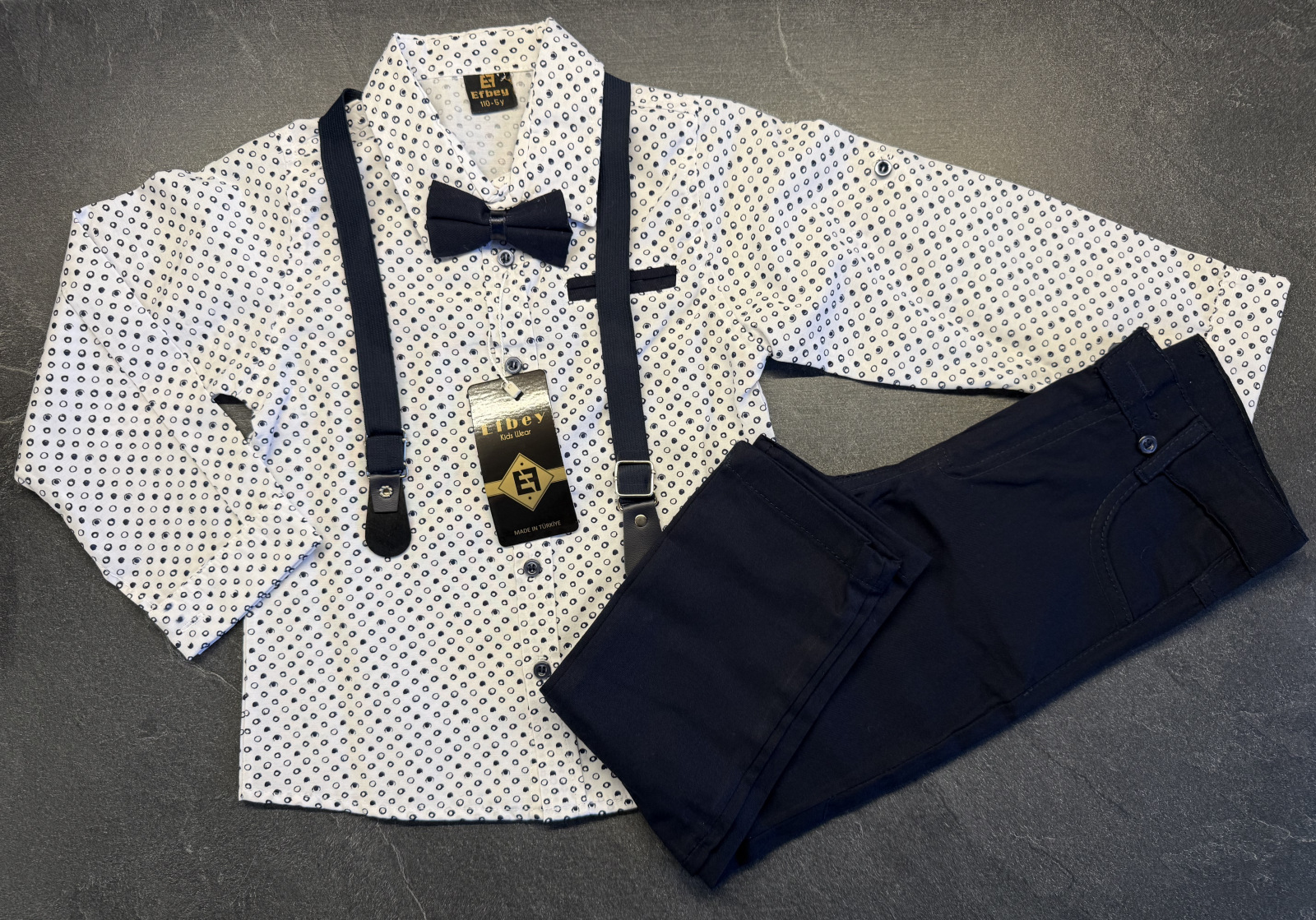 Elegantná kojenecká súprava, veľkosť na visačke na 5 rokov - 110 (orientujte sa prosím podľa rozmerov). Súprava obsahuje vzorovanú košeľu, tmavomodré nohavice, motýlik na nastaviteľnú gumičku a traky. Rozmery: košeľa dĺžka 44 cm, dĺžka rukáva od ramena 37 cm ( dá sa vyhrnúť na krátky rukáv ), nohavice vonkajšia dĺžka 62 cm, vnútorná dĺžka 40 cm, pás iba z jednej strany na nastaviteľnú gumičku.
