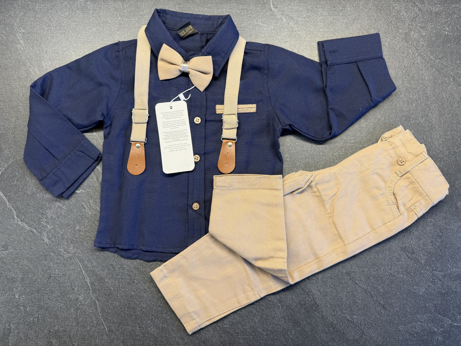 Elegantná kojenecká súprava, veľkosť na visačke na 3 roky - 98 (orientujte sa prosím podľa rozmerov). Súprava obsahuje tmavomodrú košeľu, béžové nohavice, motýlik na nastaviteľnú gumičku a traky. Rozmery: košeľa dĺžka 39 cm, dĺžka rukáva od ramena 33 cm ( dá sa vyhrnúť na krátky rukáv ), nohavice vonkajšia dĺžka 53 cm, vnútorná dĺžka 33 cm, pás vzadu s gumičkou.