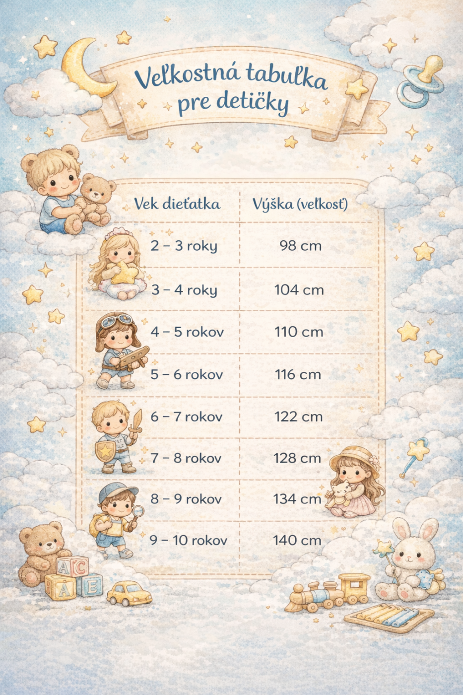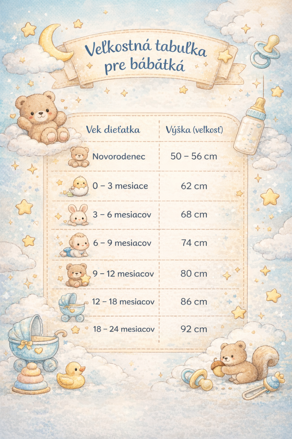 Každé bábätko rastie individuálne, preto odporúčame riadiť sa najmä výškou dieťatka (v cm), ktorá najlepšie zodpovedá veľkosti oblečenia.