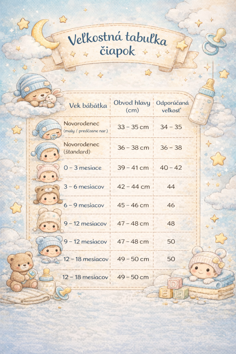 Naša veľkostná tabuľka vám pomôže jednoducho vybrať tú správnu veľkosť, aby sa vaše bábätko cítilo pohodlne a malo dostatok priestoru na pohyb.